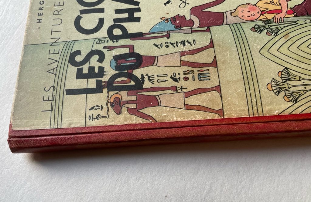 Cette restauration concerne un exemplaire ancien de Tintin – Les Cigares du Pharaon, attribué à une conservation datant de la période de la Seconde Guerre mondiale et imprimé sur un papier particulièrement fragile, typique des fabrications de guerre : fibres pauvres, cellulose instable, collages acides.